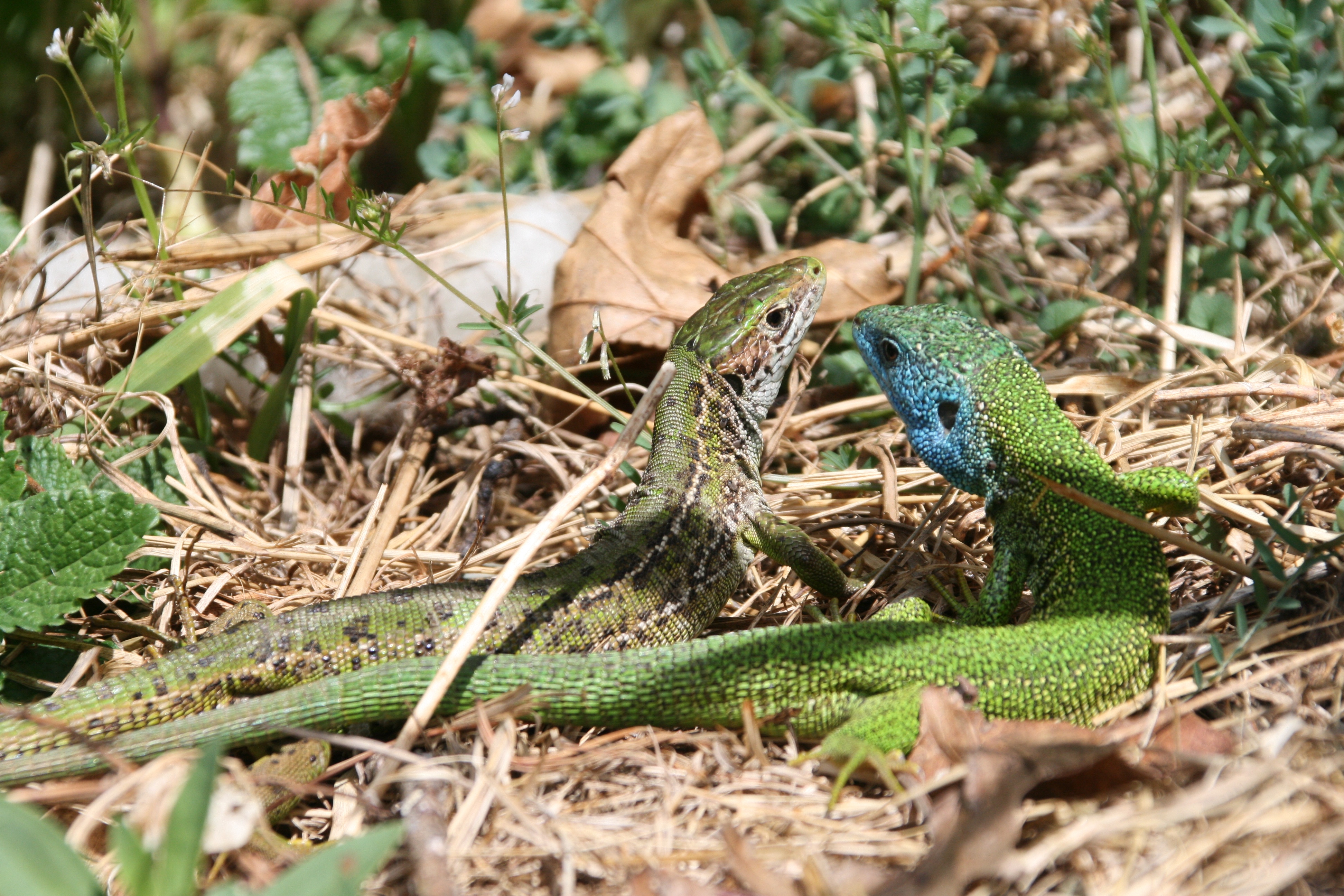 Smaragdeidechsen sonnen sich auf dem Mulch unseres Gartens