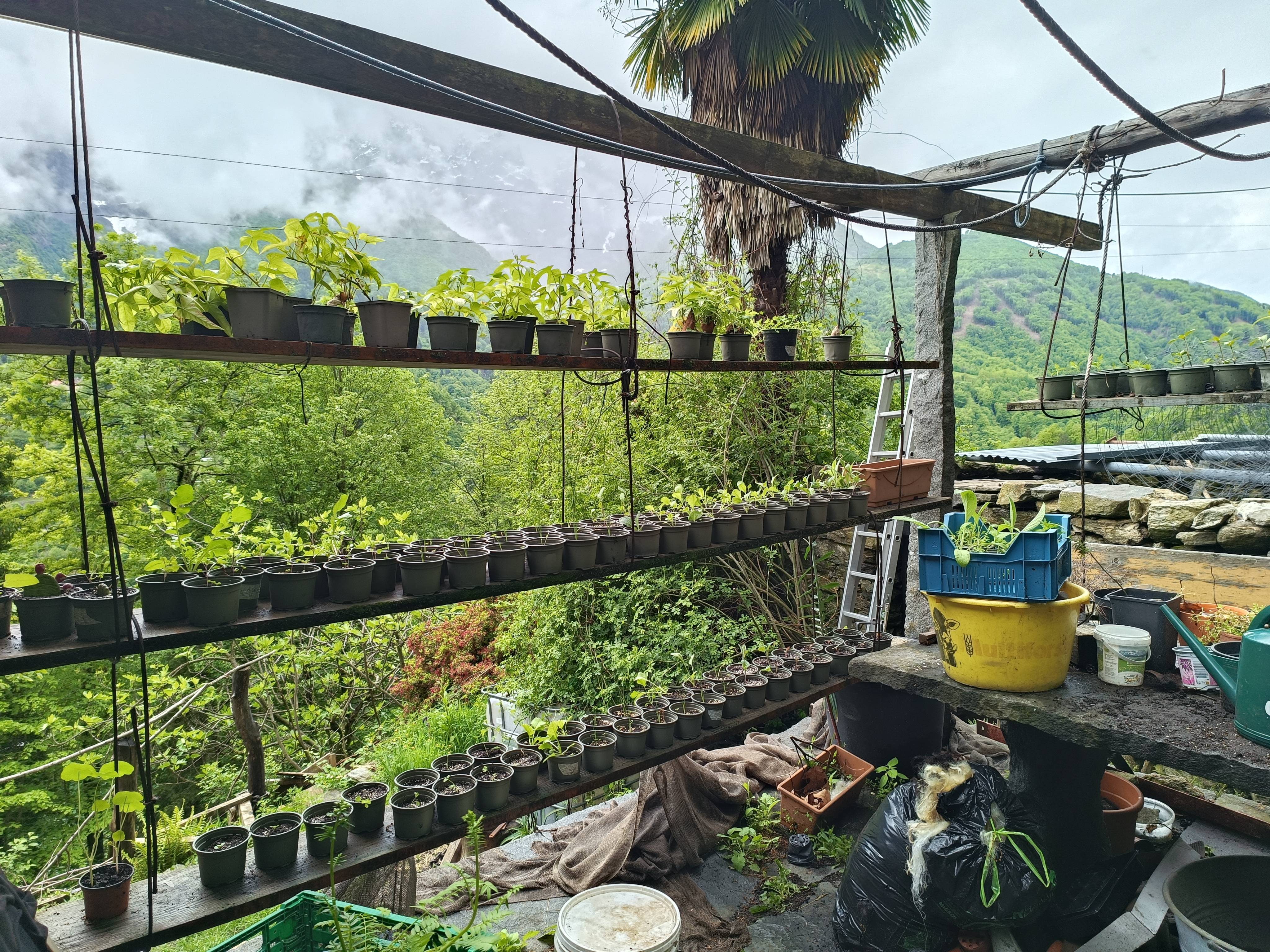 Zwischen den Dörfern Lionza und Verdasio, direkt am Wanderweg Via Marcato, liegt der Garten Vignascia. Er ist nach Süden ausgerichtet und befindet sich auf rund 650 Metern über Meer. Das Gelände ist steil, der Boden trocken und sandig. Die grösste Herausforderung besteht darin, Wasser und Nährstoffe in den Boden zu bringen. Im Sommer wird es für viele Pflanzen zu heiss, weshalb wir sie beschatten müssen. Einige jedoch – wie Chili oder Tomatillo – lieben die Wärme und gedeihen prächtig. So suchen wir geduldig für jede Pflanze den idealen Standort. Im Winter wiederum können wir an den Hängen Wintergemüse wie Pak Choi, Chicorée oder Federkohl ernten.
