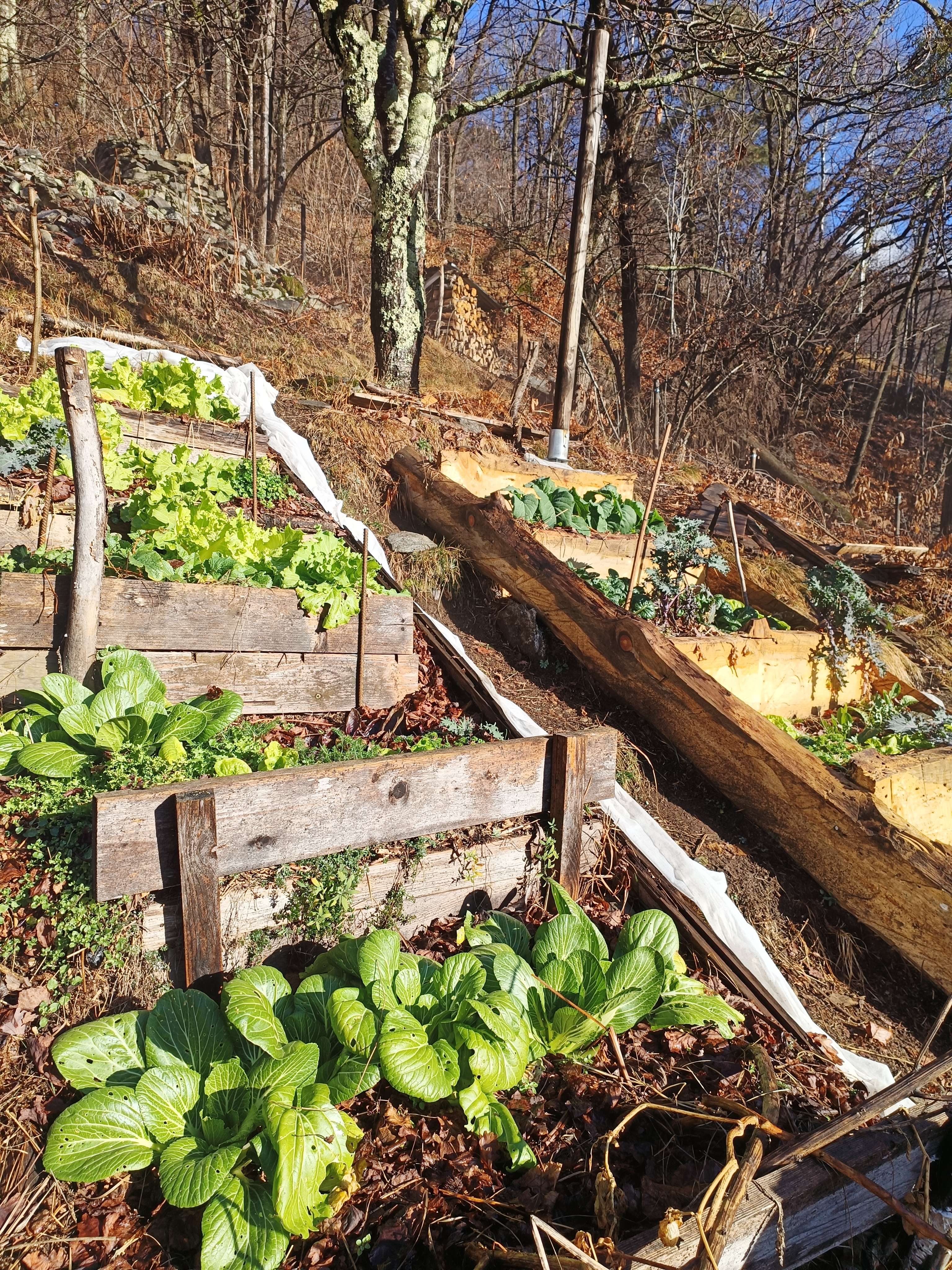 Cresto liegt zuhinterst im Centovalli am Nordhang auf ca. 850 M.ü.M. Eine relativ flache Wiese von 1500m2 verwandeln wir langsam in einen Garten. Die Sonneneinstrahlung ist weniger stark und hier wachsen Salate, Kohlarten und Kräuter. Der Boden ist lehmiger und kann dadurch Wasser besser halten. Im Winter wird es hier kälter, so dass weniger Wintergemüsesorten angebaut werden können.