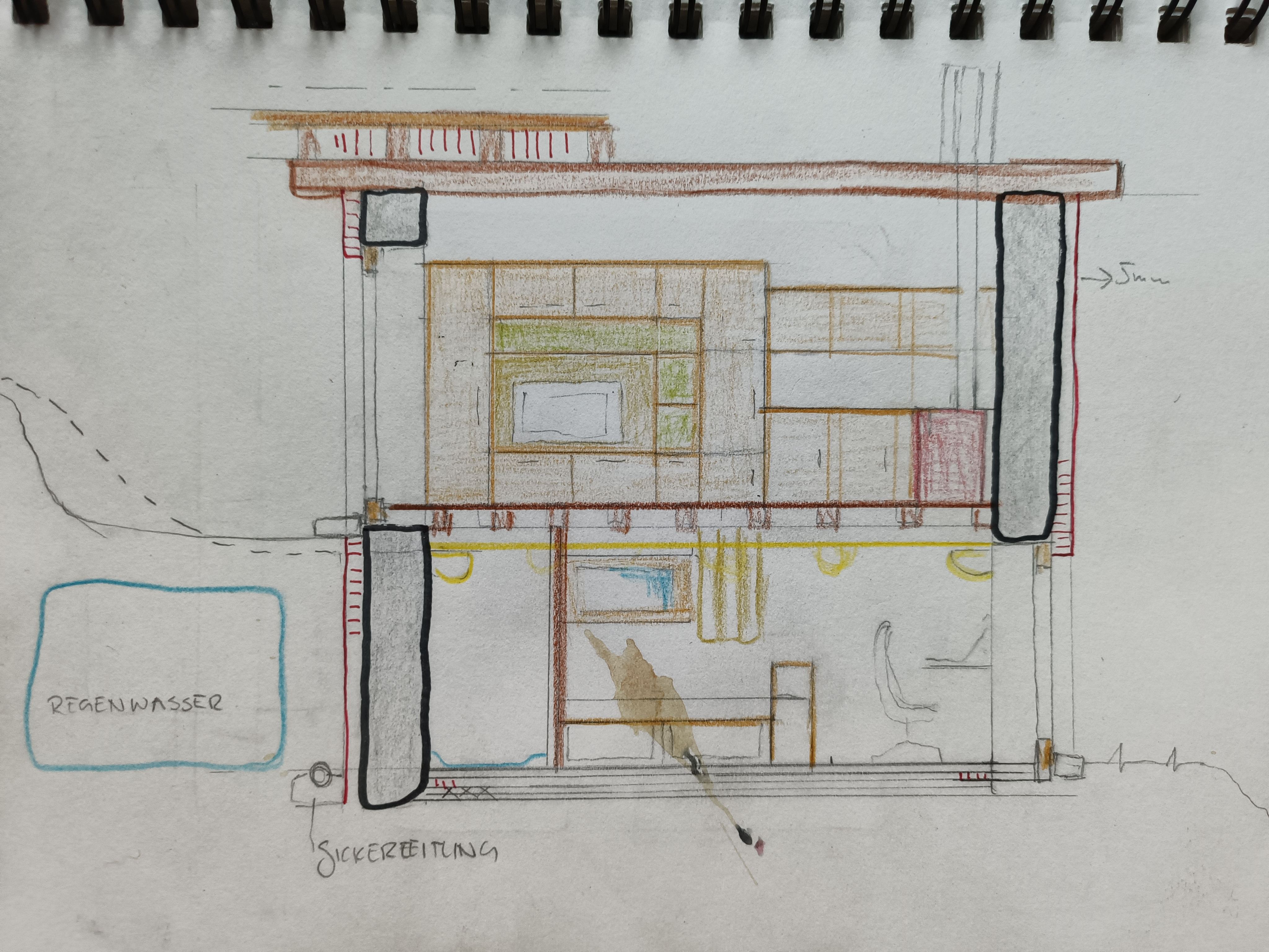 Seitenansicht mit Regenwassersystem und Sickerleitung