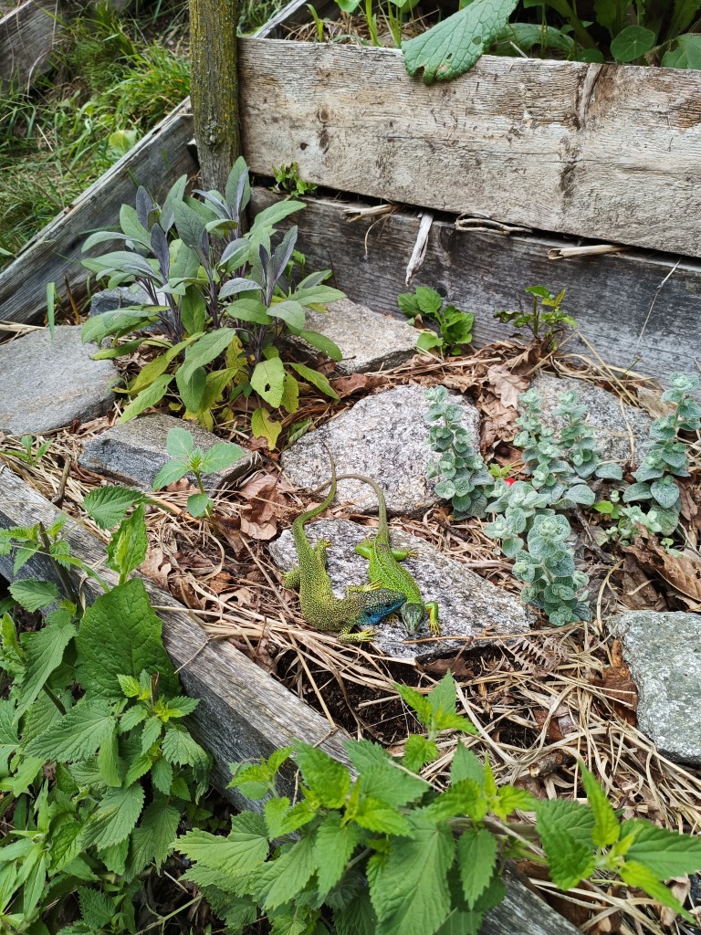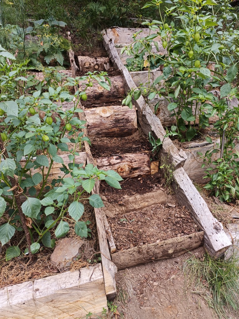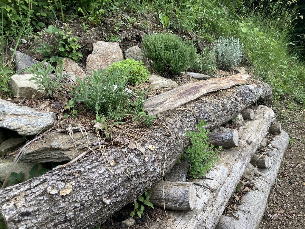 Hänge stellen Gärtner oft vor Herausforderungen: Erosion, schwierige Bewässerung und rutschende Erde. Doch mit der richtigen Terrassierung verwandeln wir diese scheinbaren Nachteile in Vorteile. Hangbeete bieten verschiedene Mikroklimazonen, verbesserte Drainage und eine effiziente Raumnutzung. Die Eidechsen nutzen die Terrassen gerne zum Sonnen und Wildbienen nisten in den Gängen im Holz. Das Holz haben wir zum Teil aus unserem Wald, zum Teil sind es Resthölzer von unserem Nachbarn.